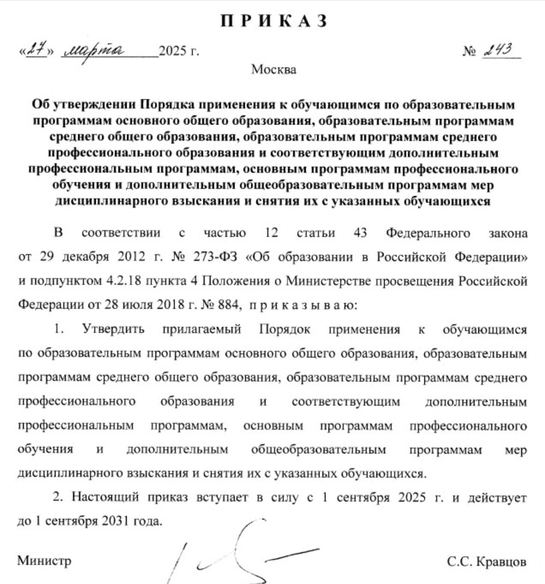 С 1 сентября 2025 г. вступает в силу Приказ Минпросвещения № 243, который обновляет правила применения дисциплинарных взысканий к обучающимся. Разбираем ключевые изменения, чтобы вы были готовы к новому учебному году! Что принципиально нового? 1. Расширен круг обучающихся, к которым можно применять взыскания: Теперь под действие порядка попадают дополнительные профессиональные программы, программы профобучения и допобразования. 2. Усилены гарантии для детей с ОВЗ - взыскания не применяются к обучающимся с: - задержкой психического развития, - нарушениями интеллекта, - иными ограничениями здоровья. 3. Электронный документооборот - теперь уведомления можно направлять через электронную образовательную среду (например, через "Сферум" или школьный email). 4. Строгие сроки для принятия решений: - 7 учебных дней - на рассмотрение мнения советов обучающихся/родителей, - 3 рабочих дня (а не учебных!) - на предоставление объяснений от ученика. 5. Отчисление - только в крайнем случае: - Нельз