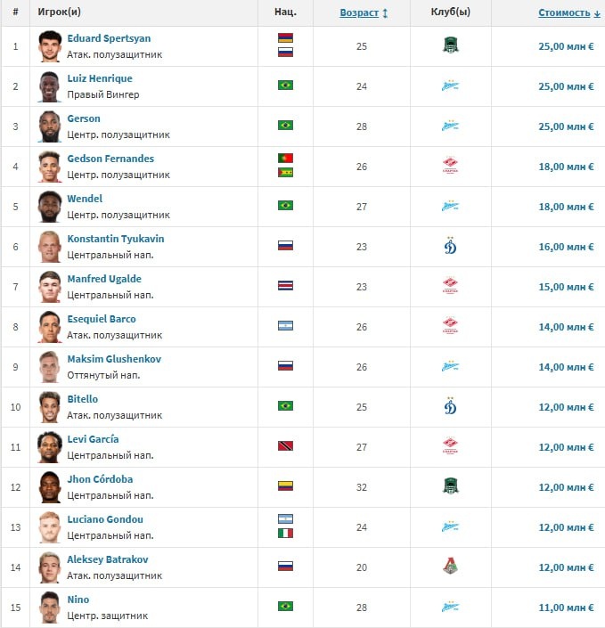ТОП -15 игроков РПЛ по стоимости на данный момент, по версии портала трансфермаркет