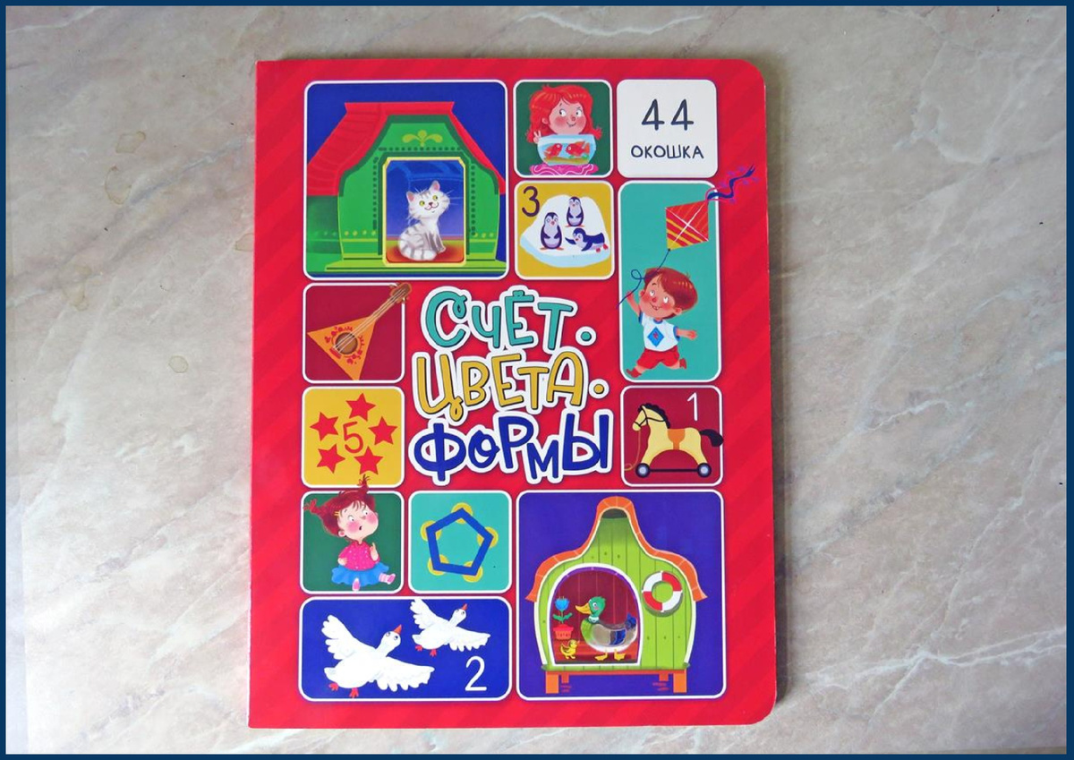 «Счёт. Цвета. Формы» - ещё одно издание в серии «Малыши открывают мир» (автор-составитель Иванова Оксана, художник Бородина Кристина). Плотный глянцевый картон и скруглённые уголки (такие во всех книжках серии) делают этот обучающий альбом формата А4 не только приятным для рассматривания, но и безопасным для самых маленьких. Маркировка информационной безопасности 0+. Дошкольник может и самостоятельно полистать книгу, разглядывая картинки, но всё-таки издание предполагает совместное занятие с взрослыми. Это именно дидактическое пособие, главной особенностью которого являются вырезные окошечки. Всего их 44. Разворотов пять. Первый из них просто знакомит с порядковым счётом, но уже здесь надо проявить внимательность, отыскивая цифры на фигурках персонажей. У кого-то это вышивка на кармашке, а кто-то держит цифру в руке. Любуясь панорамой парка аттракционов, нужно отыскать заданные объекты и пересчитать их, а проверочный ответ ожидает в соответствующем окошке, расположенном внизу страницы.