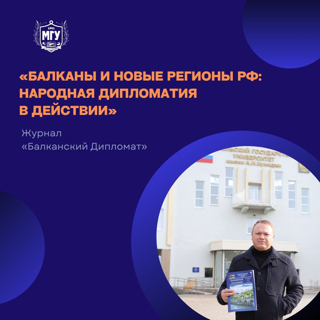 🤩 Кандидат политических наук, доцент кафедры истории и политологии МГУ имени А.И. Куинджи, руководитель Представительства Российско-Балканского центра делового сотрудничества и культуры в ДНР Евгений Вадимович Рябинин — автор материала для статьи международного аналитического журнала «Балканский Дипломат». 🔴 В своей работе Евгений Вадимович анализирует особенности сотрудничества балканских государств с историческими территориями России на примере ДНР и ЛНР. В статье использованы фотоматериалы выставки «Новые регионы. Мариуполь» фотографа-документалиста Сергея Константиновича Венявского. ◼️ Как российские регионы налаживают международные связи — читайте в журнале. #МГУимениКуинджи