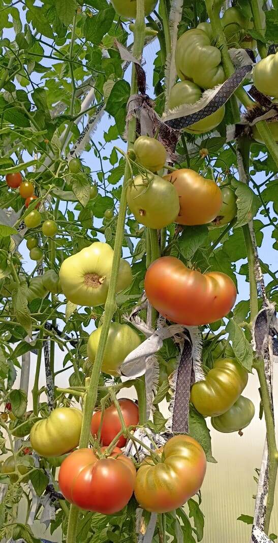 Ах как он хорошо завязал помидоры, до макушки крупные плоды! Но созревать стал поздновато! Впрочем, как и все остальные помидоры! Сезон получился такой! Практически целый июнь и первая декада июля лили дожди! Погода очень не комфортная для томатов! А как пошло тепло, вот они и стали нас радовать!!! 🍅 Краткий "портрет" сорта Томат Дикий Тимьян— среднеспелый индетерминантный сорт американской селекции. Отличается экзотической окраской плодов оливково-зелёные с розовыми румянцами, высокой урожайностью в теплицах и насыщенным сладким вкусом. Подходит для открытого грунта и теплиц, но требует тщательного ухода. ✅ Плюсы сорта. 1. Плоды очень сладкие, мясистые, с сочной мякотью. Мякоть сохраняет плотную структуру, не растекается при нарезке . Аромат выраженный, "фруктовый", что ценится в свежих салатах и соусах . 2. Урожайность высокая! Но требует стабильного тепла. Плодоношение длительное с июля до заморозков. 3. Устойчив к болезням к фитофторозу, вертициллезу, фу