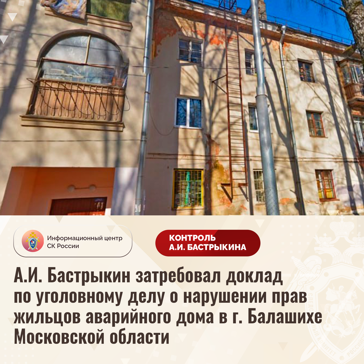 А.И. Бастрыкин затребовал доклад по уголовному делу о нарушении прав жильцов аварийного дома в г. Балашихе Московской области