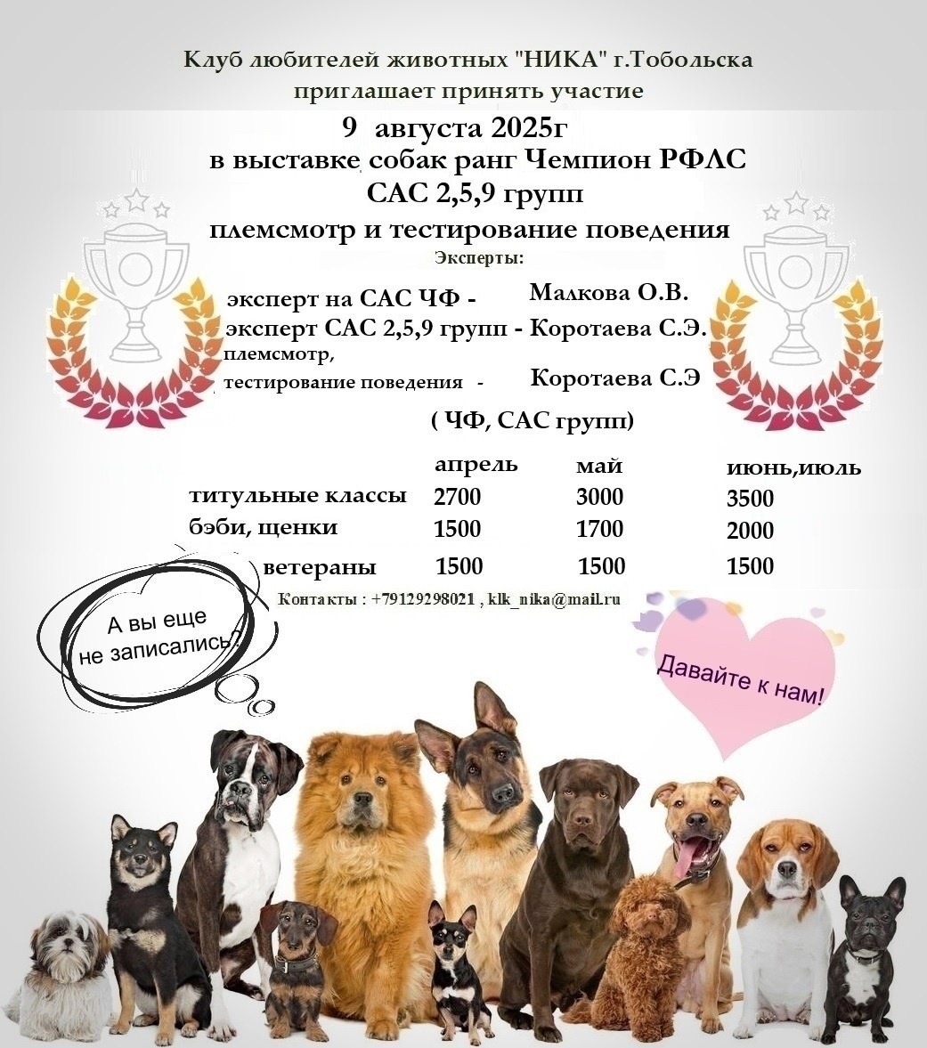 ⏰ 9 авг (7д) 🏛 #Тобольск #Тюмень #Россия #Выставка 🐶 Выставка собак: Клуб любителей животных "Ника" 🏆 Клуб любителей животных "Ника" Контакты организаторов здесь: 🌐 https://www.petsman.ru/vystavki-sobak.php?mesto=638-tobolsk