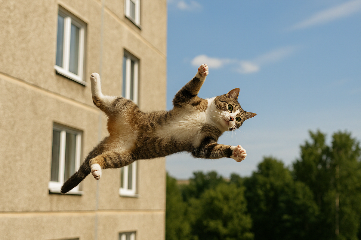 Кошка, падающая с 12-го этажа, выживает. А та, что с 7-го — может не дотянуть. Что?.. Как вообще это работает? Мы же вроде учили физику. Чем выше — тем больнее. А тут какая-то антинаука. Но нет — всё объясняется. Просто мир кошек устроен немного иначе. Или совсем иначе. Когда кошка падает с высоты, у неё срабатывает древний инстинкт — «правильно сгруппироваться». Это не миф: кошки действительно разворачиваются в воздухе, выставляют лапы и максимально распределяют нагрузку на тело. Такой себе встроенный парашют из лап и хвоста. Но вот фокус: чтобы это сработало, нужно время. А с 5–6 этажей этого времени может не хватить. С 12-го — хватает. Кошка успевает выйти в режим терминальной скорости (это когда быстрее она уже не летит), расслабить мышцы и принять «приземлённую» позу. То есть: на старте — паника, в середине — йога-ниндзя, на финише — акробат в полёте. Это безумие, но оно реально работает. Терминальная скорость у кошки — около 100 км/ч. И да, это звучит как кошмар. Но когда она до