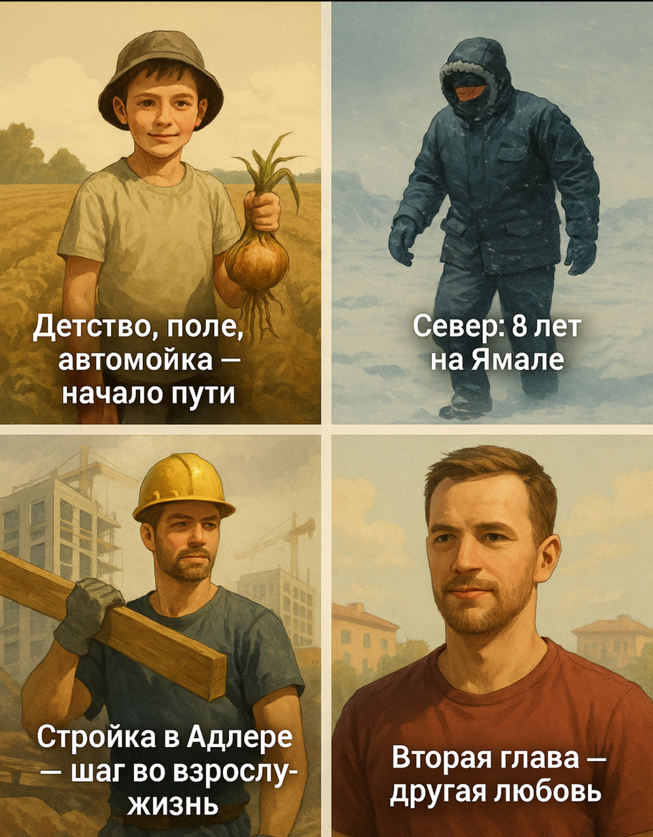 💪 От поля до Севера: моя история Привет, меня зовут Николай. Я родом из посёлка Весёлый, что в Ростовской области. Сколько себя помню — жизнь не баловала, но всегда была интересной. Всё, чего я добился — результат труда, мозолей и ошибок, из которых я учился. 🧒 Детство, поле, автомойка — начало пути С самого детства я понял: чтобы что-то иметь — надо работать. Каждое лето я трудился на поле. Собирали лук, работали на току — месте, где сушат и грузят зерно. Там я заработал свои первые деньги. А в 16 лет устроился на автомойку. За смену можно было получить до 1000 рублей. Для подростка это казалось чем-то невероятным. Именно тогда я осознал: хочешь — работай, и будет результат. 🏗 Стройка в Адлере — шаг во взрослую жизнь В 17 лет уехал в Адлер, работать на стройке. Это было время подготовки к Олимпиаде. Жил в вагончиках, заливал бетон, работал с утра до вечера. Было трудно, жарко, но и по-своему круто — настоящая школа жизни. ❄ Север: 8 лет на Ямале В 19 меня позвали на Ямал. Это