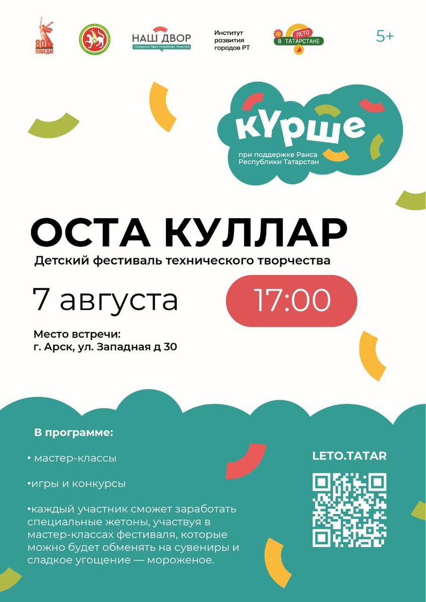 "Оста куллар" күршеләрне Арчаның Көнбатыш урамында җыя. Детский фестиваль технического творчества «Оста Куллар» в твоем дворе! 📍 Адрес: ул. Западная, 30 📅 Дата: 7 августа ⏰ Время начала: 17:00 🎉 Что ждёт наших маленьких умельцев и гостей фестиваля? 🚀 Запуски простейших ракет — изучаем физику полёта 🚗 Управляемые автомобили и суда — осваиваем искусство моделирования 🪂 Соревнования квадрокоптеров — учимся пилотированию 🤖 Битва роботов — создаём собственные механизмы и побеждаем соперников 🌬 Мастер-класс по сборке вентиляторов и светильников — делаем уникальные изделия собственными руками За успешное прохождение каждого этапа мастера получат памятные жетоны, которые можно обменять на удивительные сувениры и сладкие угощения! 🥳 Будем рады видеть всех желающих — малышей, подростков и родителей! Приглашайте друзей, соседей и близких ребятишек — пусть праздник будет ярким и запоминающи