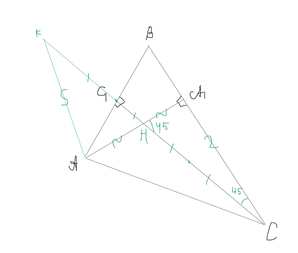 В треугольнике ABC высоты AA1 и CC1 пересекаются в точке H, лежащей внутри треугольника. Известно, что H — середина AA1, а CH:HC1=2:1. Найдите величину угла B. Тот факт, что СС1 точкой пересечения делится в соотношении 2 к 1 как бы намекает, что НС1 следует продлить на её длину и тогда вместо пересечения высот мы получим пересечение диагоналей параллелограмма. Рассмотрим треугольник АКН, в нем АС1 является и высотой и медианой, значит он равнобедренный и АК=АН, но так как АК является стороной параллелограмма, то А1С=АН. И вот мы уже получили новый равнобедренный треугольник А1НС., а так как он прямоугольный, в нем легко вычисляется оставшиеся углы - они по 45. Отлично, теперь можно приступать к четырехугольнику НС1ВА1. В нем 2 угла по 90, один 135 (смежный к 45), значит угол В=45 Ответ 45 Другие задачи раздела