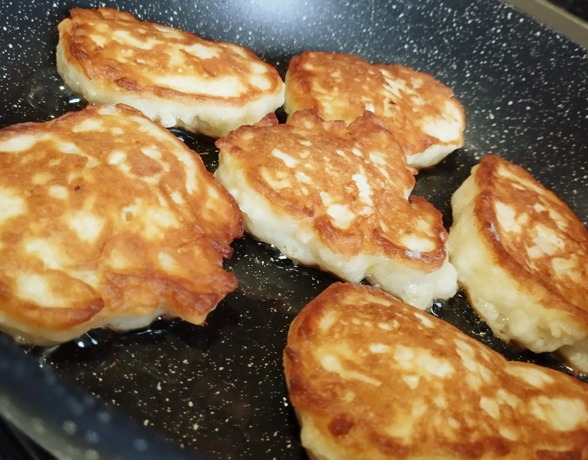 Оладьи замешиваю без яиц, просто кефир, соль, сахар, мука и в конце добавляю соду, даю постоять и жарю.