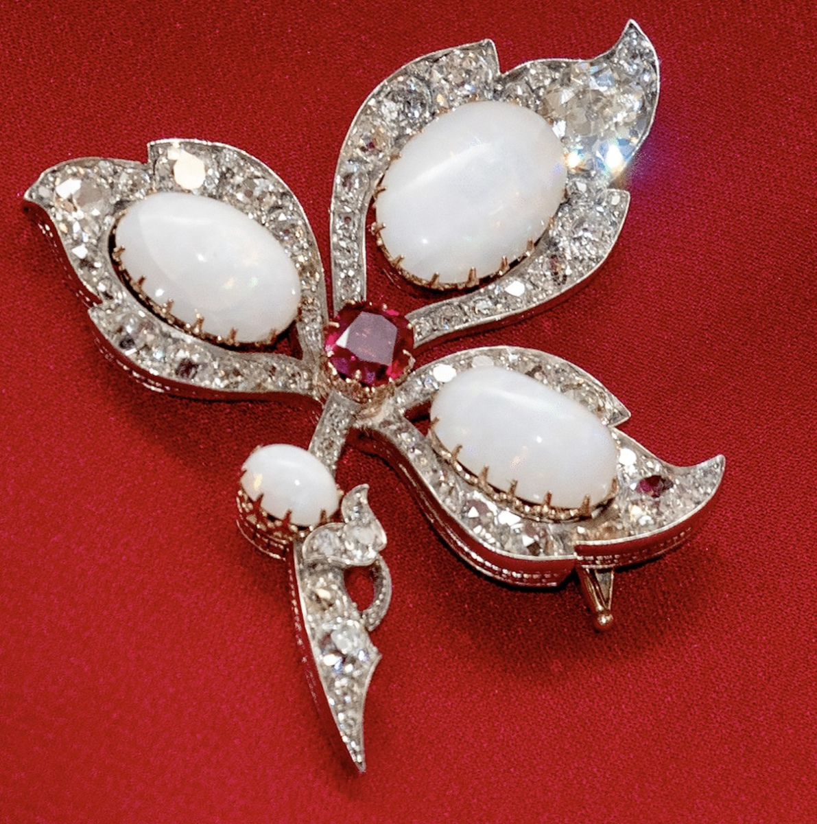 Центральную часть броши украшают четыре крупных молочных опала, которые символизируют чистоту, надежду и мир. Один из камней окружен мелкими бриллиантами, создавая эффект сияющей звезды. Вершину трилистника венчает великолепный рубин, который добавляет украшению нотку силы и решительности.