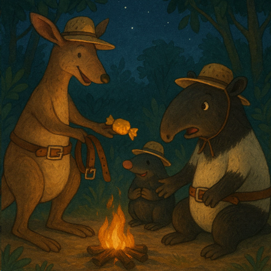 Это был день малины и комаров. Тапир с Кротоном шли по лесу, тихо споря о том, можно ли считать ягодный сок супом, когда внезапно, прямо посреди тропы, стоял он. Высокий. Мускулистый. Загадочный. С хвостом, мощными ногами и сумкой на пузе, откуда выглядывало… что-то блестящее. — Ты видишь это? — прошептал Кротон. — Я надеюсь, что нет, — ответил Тапир. — Он... подозрителен. — Он... стильный. — Он нас точно видит? Он их видел. И махнул лапой. — Привет. ________________________________________ Несмотря на тревожные слухи, которых они, к слову, не слышали, Кенгуру оказался не агрессивным, а наоборот — вежливым и с акцентом. Он вытащил из сумки: • упаковку заморских сладостей, с надписями «лимонно-соленая ириска в рисовой бумаге» и «карамель из тумана»; • две шляпы из пробки на верёвочках — «чтоб мух отгоняло, а стиль приближало»; • и два пояска из кожи таинственного существа, с бирками: “Крокодилдо. 100% натурально. Без химии. Сделано с любовью и зубами.” Тапир и Кротон переглянулись. — К