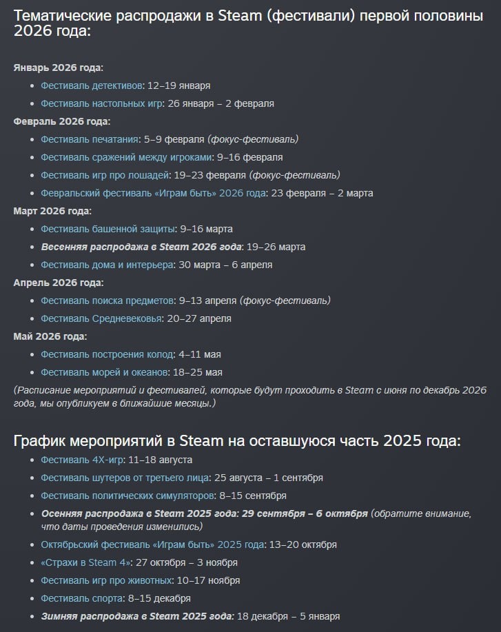 Valve выпустила официальный список распродаж на первую половину 2026 года.