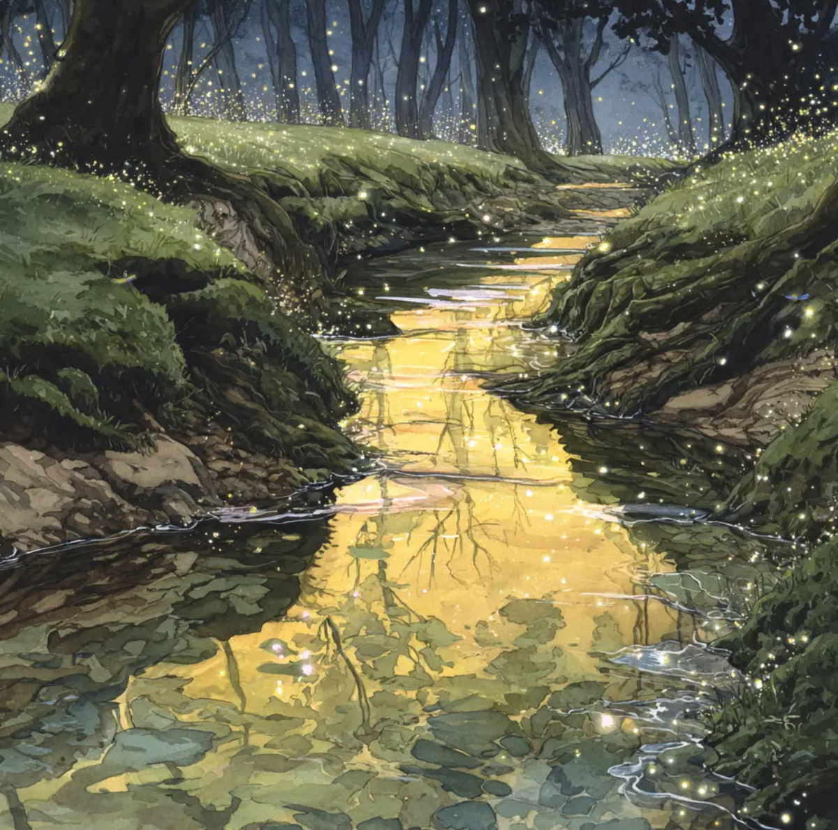 Сквозь тихий лес струится тонкая, извилистая лента — Золотой ручей. Его воды прозрачны и чисты, а на поверхности играют солнечные блики, превращая каждый изгиб в россыпь драгоценных камней. В тёплом свете заката ручей кажется сотканным из золота и света, и даже воздух вокруг него наполнен особой свежестью, которую не найти у берегов широких озер и стремительных рек. Берега ручья усыпаны мягким мхом и ускользающими тенями от склонённых ветвей, а над водой порхают серебристые стрекозы, словно хранители его тайн. Иногда кажется, что сам ручей поёт — его голос тонок и ясен, и в этой песне слышится нечто, что заставляет сердца трепетать в ожидании чего-то далекого и необъяснимо прекрасного. В глубине его вод отражаются не только облака и звёзды, но и мечты, и надежды, и самые сокровенные желания. Там, где течет Золотой ручей, пролегает невидимая граница между явью и волшебством, и каждый, кто придёт к нему с чистым сердцем, сможет найти ответ на свой самый заветный вопрос…