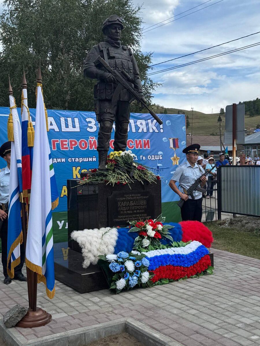 🐎 В Улаганском районе увековечили память Героя России Айдара Карабашева В День ВДВ, в Улаганском районе состоялось торжественное открытие памятника Герою России Айдару Карабашеву, погибшему при исполнении воинского долга в ходе специальной военной операции. Памятник установлен на народные средства. Его открытие стало данью уважения подвигу Айдара Карабашева и всех воинов-десантников. В мероприятии приняли участие родные и близкие Героя, представители власти, ветеранских организаций, сослуживцы, депутаты «Единой России» Максим Анисимов и Айдар Тазрашев, жители Улаганского района. Айдар Карабашев посмертно удостоен звания Героя России за мужество и героизм, проявленные при освобождении Суджанского района Курской области от нацистов. Он был опытным военнослужащим, дважды участвовал в командировках в Сирии и Чеченской Республике, награжден тремя орденами Мужества, медалью Жукова, медалью «За боевые отличия». «Памятник Айдару открыли на его родной земле, на его малой Родине - в селе У