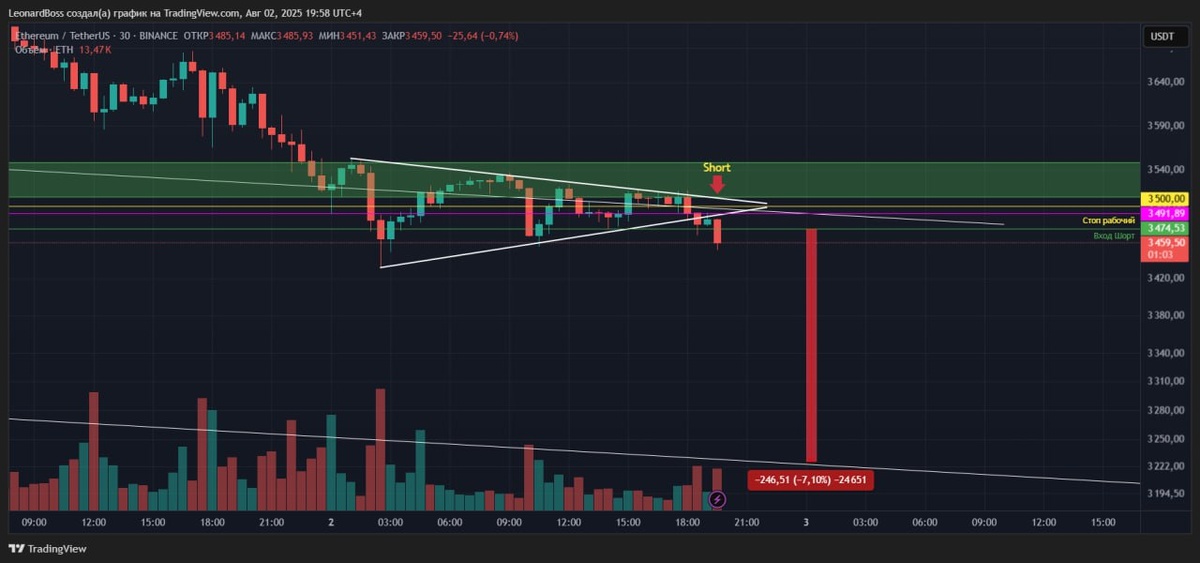 #ETH 🔽🔽🔽 ⚠️Открыл шорт по эфиру. Вывалился из локального треугольника + не смог уверенно удержать уровень 3500$. Есть конечно сомнения, что это действительный, а не ложный выход, очень неуверенно и мелкая структура мне не нравиться, ну ок, посмотрим, что из этого получится!! P.s. для лонгов ждем остановку доминации, которая всё же поехала выше. Остановку вижу в зоне уровня 62,50%, там посмотрим насколько сильная она будет!!