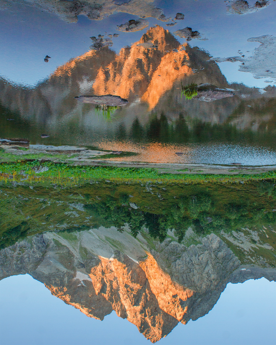 Красивый трезубец, симпатичная вечерняя подсветка, но все равно горные пейзажи с пустым небом смотрелись как-то обычно. Решил добавить немного креатива и поснимал отражения.