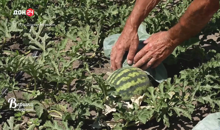 Ростовская область, 2 августа 2025. DON24.RU. Николай Подумеев, академик и агроном, поделился простыми способами уберечь рассаду арбузов и картофеля от безжалостного донского солнца. Рассказал он об этом в эфире телеканала «ДОН 24». Защищать арбузную бахчу необходимо только в том случае, если у нее недостаточно высокая ботва. В естественных условиях арбуз справляется с жарой именно при помощи этой части своего организма. «Придумал простейшее устройство – накрываем арбуз листом капусты. Таким образом, листик защищает, делает тень», – говорит Николай Подумеев. Фото: телеканал «ДОН 24» Для этих же целей арбузу полезно организовать капельное орошение – тогда у него всегда будет минимум влаги. Прибегая к такому способу, вы поможете плоду созреть равномерно. Под угрозой солнечного воздействия оказываются и картофельные клубни, если на участке недостаточно ботвы и нет сорняков. «Желательно чем-нибудь накрыть землю. С этой задачей справляется автомобильный полог белого цвета – идеально защищае