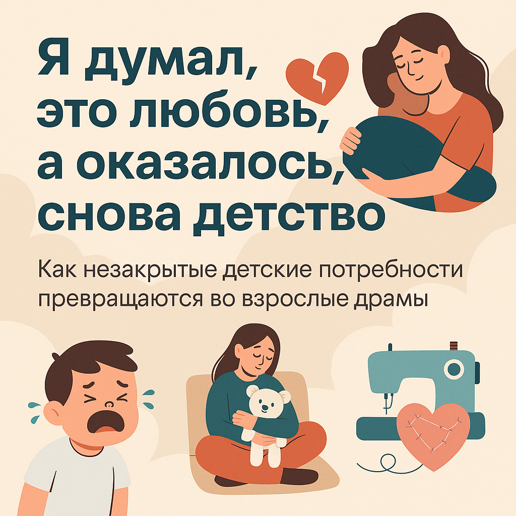 «Я думал, это любовь, а оказалось, снова детство» Как незакрытые детские потребности превращаются во взрослые драмы Вы когда-нибудь ловили себя на фразе: - «Я без него как без воздуха!». А потом, немного подумав, понимали: ну какой, к чёрту, воздух? Это же просто Саша с работы. Саша, у которого три майки, долги и аллергия на эмпатию. Добро пожаловать в мир, где вместо партнёров мы влюбляемся в свои детские травмы. А вместо отношений получаем продолжение незавершённого разговора с мамой. Или с папой. Или с тем воспитателем, который однажды сказал, что вы шумите, и теперь вы боитесь проявляться. Пример из жизни Марина (образ собирательный), 34 года, третий брак. Все партнёры - «не те»: то холодные, то «слишком прилипчивые».