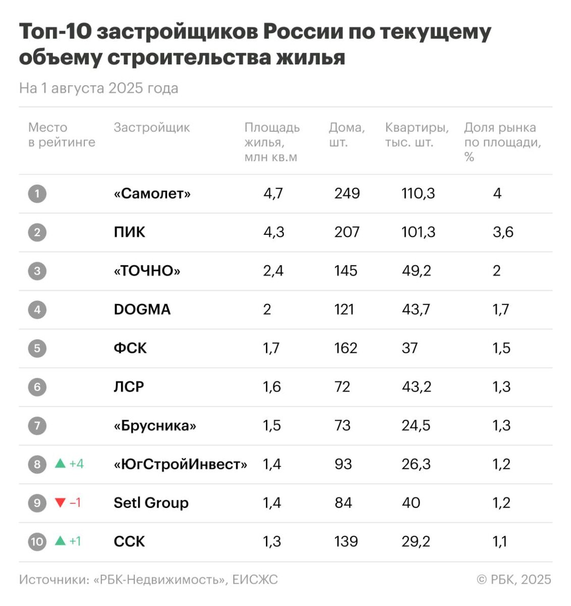 По состоянию на 1 августа рейтинг крупнейших застройщиков России снова почти не изменился — первые семь строчек заняты одними и теми же девелоперами уже полгода. А вот в конце списка «ЮгСтройИнвест» активно борется за место под солнцем — за месяц компания прибавила аж 4 позиции в рейтинге (за счёт проектов в других городах), а ССК на 10е место попал @kornienko_ru