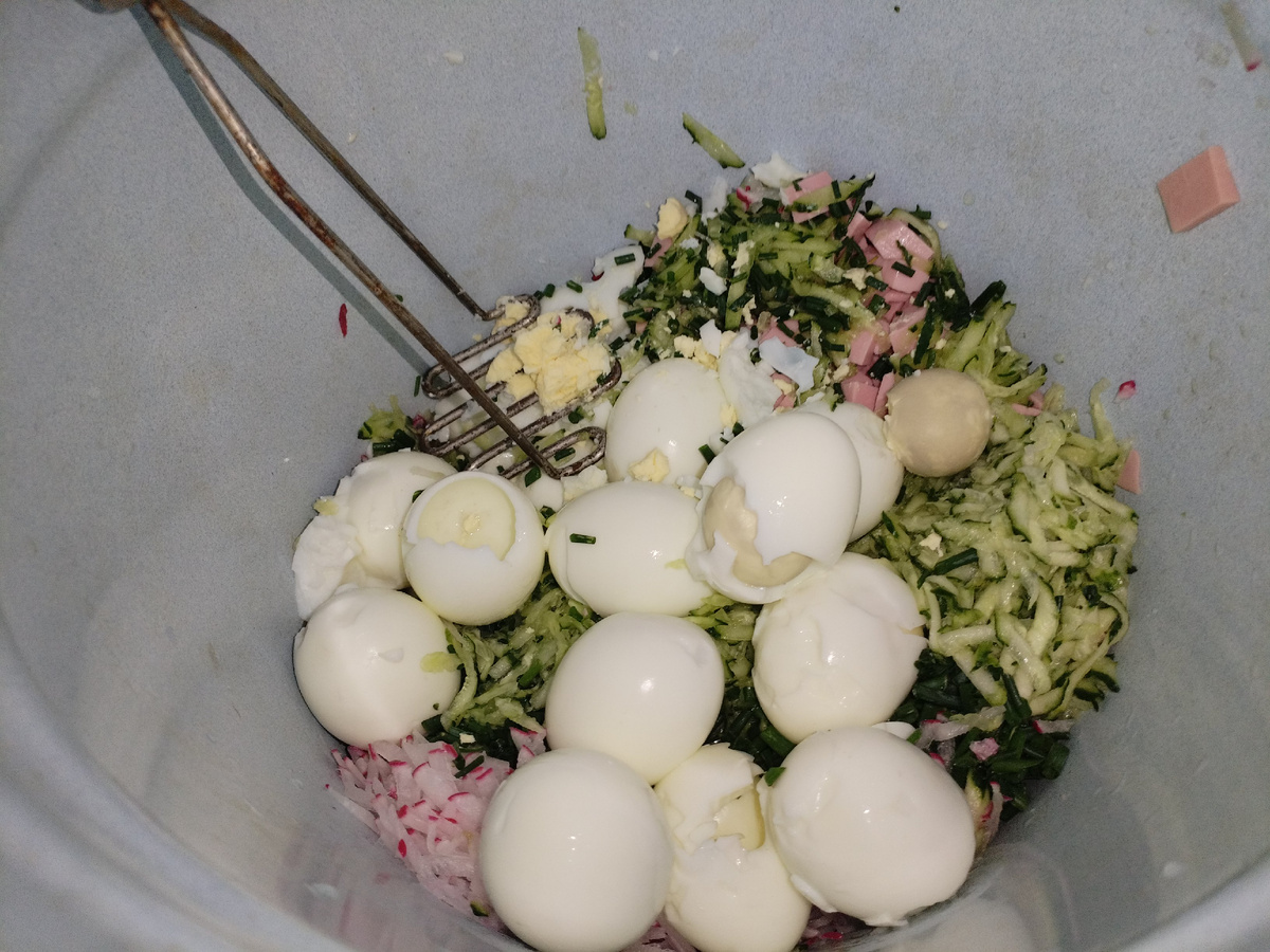 Ну ингредиенты знают все, исключения толь в одном, кто то добавляет хрен вместо редиса, и мясо вместо колбасы. Сам процесс долгий за счёт нарезки всех ингредиентов, но я нашла выход! Огурцы и редис мы конечно давно трем на терке, сначала из за бабушек, а теперь и самим так легче.😁 Зелень конечно режу, но ножницами. А вот самая долгая возня это порезать яйца и картофель. И я больше не режу Чищу и закладываю ,а потом беру венчик советского образца и давлю. Этот венчик сам режет. Так же поступаю и с картофелем. Получается и овощи с зеленью промяты дали сок и порезано быстро и мелко. Мы делаем много лет на основе кефира и минеральной воды, уксус по вкусу. Такой вкусной я нигде не ела!