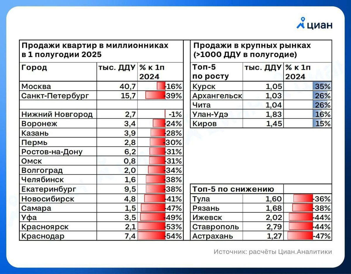 Отмена массовой льготной ипотеки привела к обвалу продаж квартир в новостройках почти во всех крупных городах России, — ЦИАН. Рост, по большей части, зафиксирован в регионах, где действуют спецпрограммы, например, дальневосточная ипотека или просто началось активное строительство. Наибольший обвал — в Краснодаре (-54%), где отмена льготной программы совпала с замедлением миграции в регион со стороны более холодных российских субъектов (тк там начали строить хоть что-то) Не обрадую читателей, но к снижению цен в Краснодаре это все равно не приведет @kornienko_ru