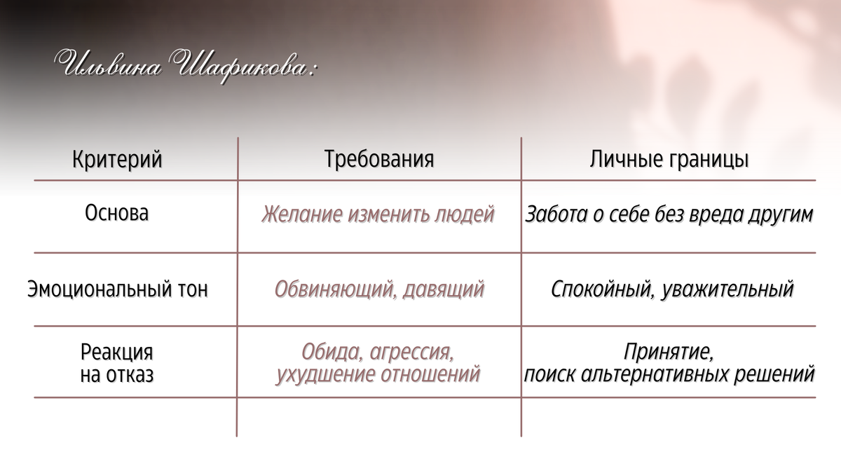 Личные границы — это способ обозначить приемлемые правила взаимодействия. Они выражаются через спокойный диалог, где проговариваются пожелания и просьбы о том, как именно следует обращаться. Благодаря договорённостям исчезают недопонимания и складываются условия для дружелюбной коммуникации. А вот выдвижение требований и ультиматумов воспринимается большинством людей как грубость или контроль, и это вовсе не способствует сотрудничеству (Шэрон Мартин).