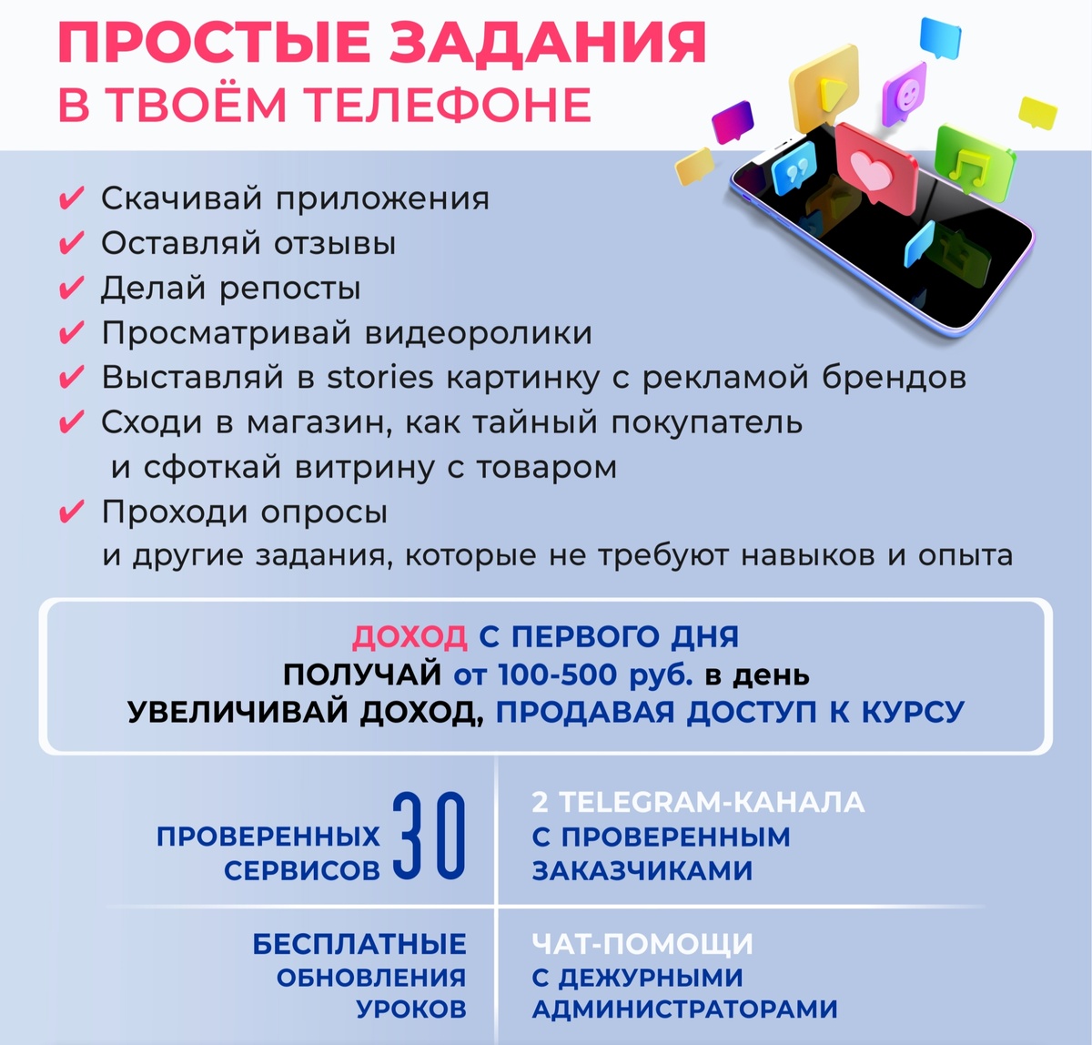 Никогда не понимала людей, которые разбрасываются деньгами. Вот предлагают им заработать 200, 300 или 500 рублей, а они все ищут предложения повыгоднее. Причем без опыта и особых навыков. Сразу побольше денег, где особо и напрягаться не нужно. Сыр бесплатный до сих пор в мышеловке 🪤 лежит и не советую за ним гнаться. Лучше начинать с малого... Не так уж часто пишет здесь о своей работе. Но когда появляются классные предложения, не могу удержаться. До 31 августа будет действовать последняя летняя акция🔥 на курс по заданиям Вы сможете выполнять простые задания в своём телефоне, которые делаете регулярно в социальных сетях. У вас будет доступ к 30 проверенным сервисам, где вы сможете зарабатывать от 100-500 рублей в день. Многие наши девочки зарабатывают и 1000 при наличии большого свободного времени. До конца августа доступ к курсу всего 990 рублей. Такое предложение бывает только раз в месяц. Успейте запрыгнуть в счастливый вагон. Стоимость курса можно отбить буквально за пару