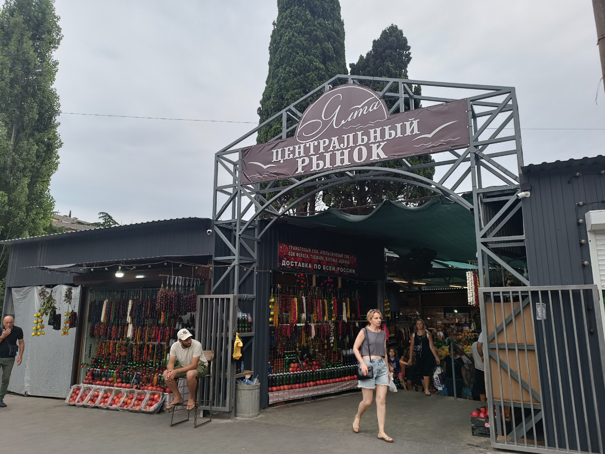 Сегодня 2 августа, суббота. Погода пасмурная. По прогнозу передают штормовое предупреждение. Мы поехали на автовокзал Ялты за билетами. Сам вокзал на ремонте, поэтому кассы и отправление с троллейбусной станции, находящейся через дорогу. Пройдя через подземный переход проходим мимо супермаркета Яблоко. Пару слов о нём: можно получить накопительную карту и создать личный кабинет. Баллы сохранились ещё с прошлого года. В магазине хорошая собственная кулинария. Цены ниже чем в ПУДе. Банкоматы на входе-выходе. Вход в центральный рынок в 100м от Яблока. Ранее Центральный рынок располагался на ул. Киевской. Но сейчас, в связи с реставрацией, он переехал к автовокзалу. Рынок крытый, непогода ему не страшна. На входе предлагают попробовать напитки. Площадь в центре занята продавцами овощей и фруктов. Некоторые прилавки, где есть ценники мы сфотографировали Но в большинстве случаев ценников на прилавках нет и нужно спрашивать Много разных сортов и поэтому смысл сравнивать общие цены - нет. М