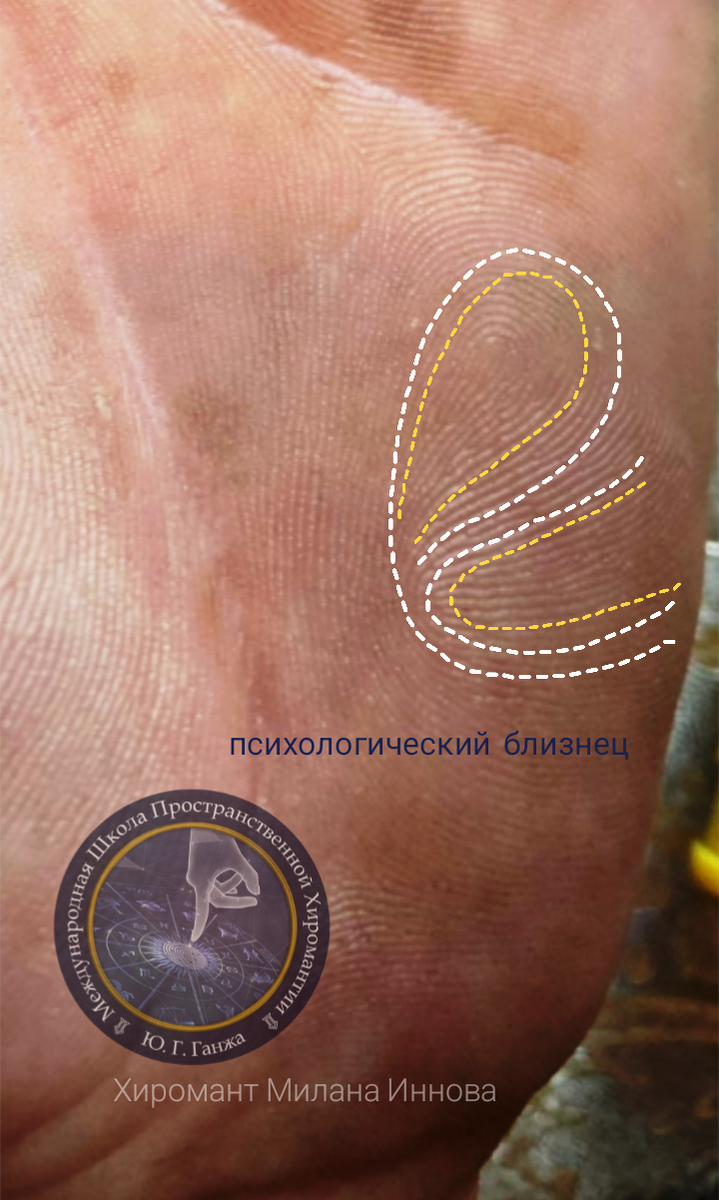 🚩ПСИХОЛОГИЧЕСКИЙ БЛИЗНЕЦ🚩 🖍Холм Луны часто богат на разные папиллярные узоры. 🖍Сейчас речь пойдёт о петле, которая представлена двумя разнонаправленными потоками или о петле-близнеце, её ещё в литературе на называют психологический близнец. Вообще это один из вариантов разнонаправленных потоков, а их бывают интересные вариации. 🔹На моей практике подтверждаются случаи, когда у людей, несмотря на то, что они обладают качествами психолога и могут оценивать ситуацию, а также людей с разных сторон, со временем наблюдается раздвоение сознания, поэтому наблюдая за самим собой они и могут как никто другой понять такого же человека и дать совет как выйти из подобной ситуации или как с этим грамотно уживаться и взаимодействовать. 🔹Очень много зависит от того, на руках какого типа она расположена, какие иные сильные или слабые признаки личности на них представлены и от этого смотрим как взаимодействуют они вместе. 🔹Поэтому кому-то она добавит больше фантазии, разных, нетрадиционны