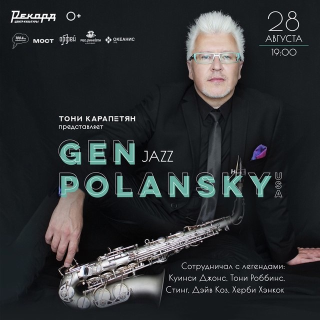 28 августа в 19:00 на сцене «Рекорда» выступят Gen Polansky и Тони Карапетян! Gen Polansky - победитель Hollywood Music In Media Awards, саксофонист, композитор и продюсер. Американский талантливый музыкант, выступавший и сотрудничавший со всемирно известными музыкантами, такими как: Куинси Джонс, Стинг, Тони Роббинс, Дэйв Коз, легенда джаза Херби Хэнкок. Он свободно переходит от джаза к року, поп, соулу, фанку и R&B, латино-бразильской и современной музыке, как исполнитель и композитор. Музыкальные выступления Gen Polansky всегда вдохновлены всем лучшим из джаза, диско, соула, танцевальной музыки и ритм-н-блюза. Однако он добавляет к этому современное звучание и собственное прочтение происходящего в мире и музыке сегодня. Gen создал глубоко личный и уникальный сплав музыкальных жанров и влияний, объединённых его насыщенным и выразительным звуком саксофона, демонстрируя поразительную универсальность. 😄 Мероприятия Нижний Новгород. Я местный!