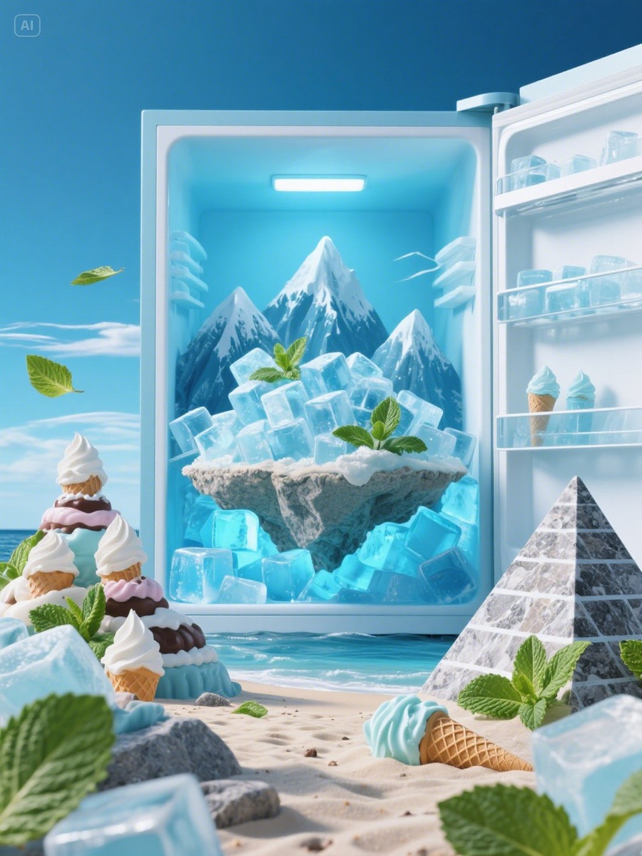 Текстовая подсказка: Остров, построенный внутри гигантского холодильника: горы кубиков льда, гранитные пляжи и пирамиды из мороженого, ветер обдувает листья мяты. Стиль: веселый сюрреалистический взгляд, ледяной синий свет, чистая эстетика с преувеличенными элементами и сладкими текстурами.