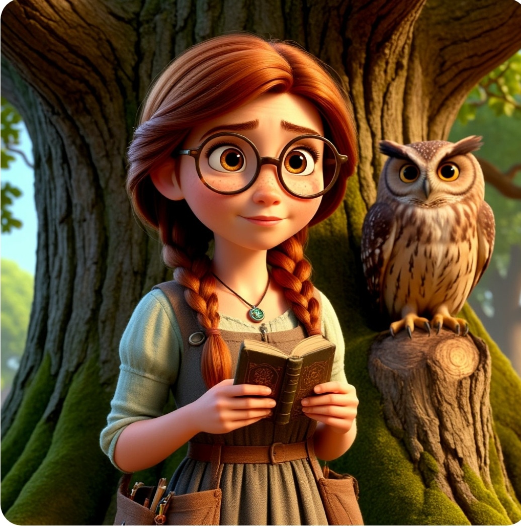 Тишина Старой Библиотеки была особенной. Она не давила, а обволакивала, как теплый плед, сотканный из шелеста страниц и скрипа древних переплетов. В самом сердце этого книжного королевства, за столом, уставленным стопками фолиантов, сидела Ариэль. Ее умные глаза за круглыми очками (сегодня они особенно ярко блестели) быстро пробегали по строкам «Сказаний о Лунном Лесе». Аккуратная коза лежала на плече, а пальцы инстинктивно поглаживали кулон-книжку на шее. В больших карманах ее удобного платья надежно покоились верные спутники: маленькая, но невероятно важная книжка-ключ с серебряным замочком и заточенный карандаш для заметок. Ариэль не просто читала. Она исследовала. Сегодня ее цель была необычной: найти пропавшую главу из «Сказаний». Глава под названием «Тишина Лунного Родника» была ключом к пониманию, как успокоить вечно бурлящий Родник Желаний в сердце леса. Без нее сказка теряла смысл, а сам Лунный Лес в книжных мирах, как шептались библиотечные духи, начинал чахнуть. Внезапно кулон на шее Ариэль вспыхнул теплым, ровным светом. «Истина рядом... или магия слов?» – подумала она. Свет указывал на старую, потрепанную карту Лунного Леса, вложенную между страниц. Ариэль аккуратно развернула ее. Карта была подробной, но... на месте Лунного Родника зияла пустота, словно его вырвали. Вместо него был нарисован лишь вопросительный знак. Рядом с картой лежал странный компас. Стрелка не указывала на север. Она беспокойно вращалась, словно искала что-то невидимое. Ариэль вспомнила прочитанное в «Основах Картографии Волшебных Земель». «Когда место стерто, ищи его след в легенде карты», – гласило правило. Она внимательно изучила края пустоты. Там были едва заметные линии, похожие на корни дерева. А на полях карты мелким почерком было написано: «Где корни Мудрого Дуба целуют камень, там ищи начало пути к Тишине». Мудрый Дуб! Он был на карте! Ариэль быстро сориентировалась и поняла, что камень у его корней – это отправная точка. Компас же, видимо, реагировал на магию пропавшей главы. Он будет ее проводником. Волнение заставило очки Ариэль слегка запотеть. Она протерла их краем платья, глубоко вдохнула и достала свою книжку-ключ. Прикоснувшись к серебряному замочку, она мысленно произнесла название книги и пожелание: «К корням Мудрого Дуба в Лунном Лесу!». Книжка раскрылась, страницы засветились ослепительным светом. Ариэль шагнула вперед. Она очутилась под сенью гигантского Дуба. Воздух пах хвоей, мхом и чем-то древним. Кулон светился ярче. Рядом на ветке сидела огромная сова с глазами цвета лунного камня.