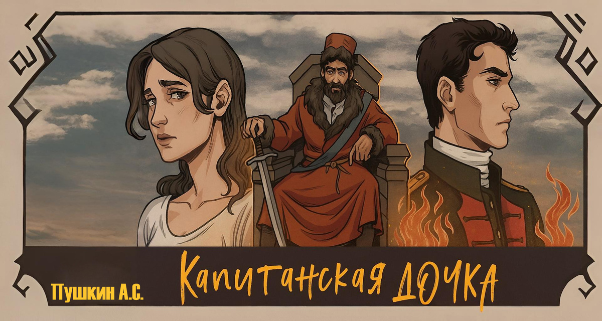 Пушкин написал не только роман, но и отдельное историческое исследование — «История Пугачёва». Это был первый случай в русской литературе, когда художественный и исторический подходы переплелись настолько тесно. В центре сюжета — судьба молодого офицера-дворянина Петра Гринева. Его жизнь резко меняется после того, как он оказывается втянутым в события Пугачёвского бунта. Пётр — сын помещика, воспитанный в духе долга, верности и чести. Он — человек дворянского круга, и его образ с самого начала романа вызывает симпатию: он добродушен