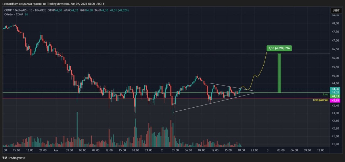 #COMP 🔼🔼🔼 ⚠️Лонг, маржа, х3. Я взял чуть ниже текущей цены. Можно не спешить и чекнуть выход из треугольника!!! P.s. коллеги, плечи и размер стопов на ваше усмотрение и соответствующие риски!! Думаю, что пока идей хватит на сегодня = наблюдаем и ждем отработки!!