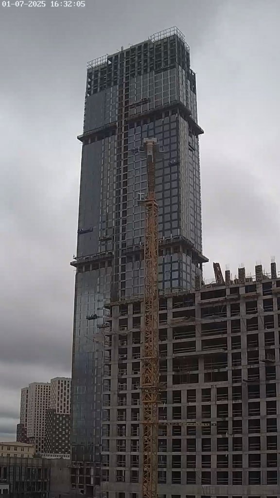 прогресс в работах по остеклению фасадов. Четыре месяца здесь не было движения. И вот в июле практически полностью дожали навершие. В кадр попадает и 19-ти этажный корпус «Олимп». Здесь за прошедший месяц возвели шесть новых этажей и уже приступили к формированию бетонных конструкций кровли. Здесь же видны и очертания знаменитой «выемки», техническое устройство которой на фасадах будущих зданий ранее интересовало многих. На скриншотах изменения с 01 июля по 02 августа. Камера #апсайдтауэрс 😊 Небоскрёбы России