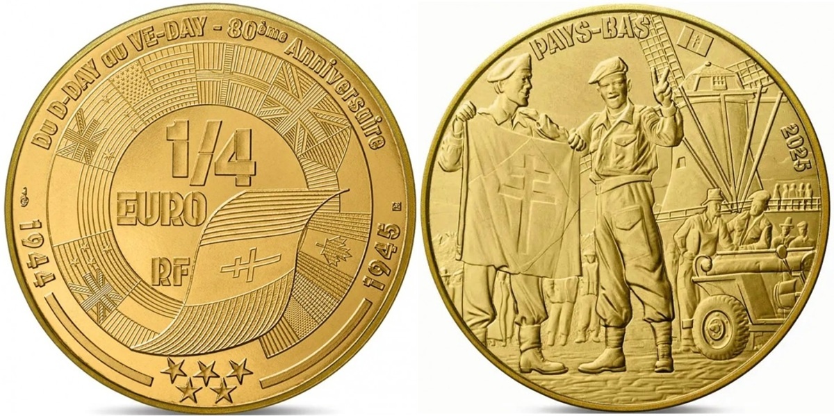 В свое время мы рассмотрели монеты к 80-летнему юбилею Великой Победы, выпущенные в бывших советских республиках Но традиционно победу над нацистской Германией отмечают и на монетах других стран. Так, к юбилею капитуляции Германии Франция выпустила серию памятных монет под названием «VE Day». Этот термин возник еще в 1944-м в ожидании победы. Среди доступных для коллекционеров монет - четыре четвертака, на реверсе которых изображены американские, канадские, французские и британские солдаты на фоне достопримечательностей разных стран: Сингапура, Чехословакии, Нидерландов, Германии. На аверсе - флаги стран-союзниц антигитлеровской коалиции, которые принимали участие в высадке войск в Нормандии. СМ. ГАЛЕРЕЮ Также стоит отметить серебряную монету номиналом 10 евро: Триумфальная арка у Вечного огня, флаги четырех стран-союзниц и голуби мира. На аверсе лавр и дуб символизируют победу. Великобритания к 80-летию Дня Победы в Европе выпустила 50 пенсов с голубем мира (его обновленную версию соз