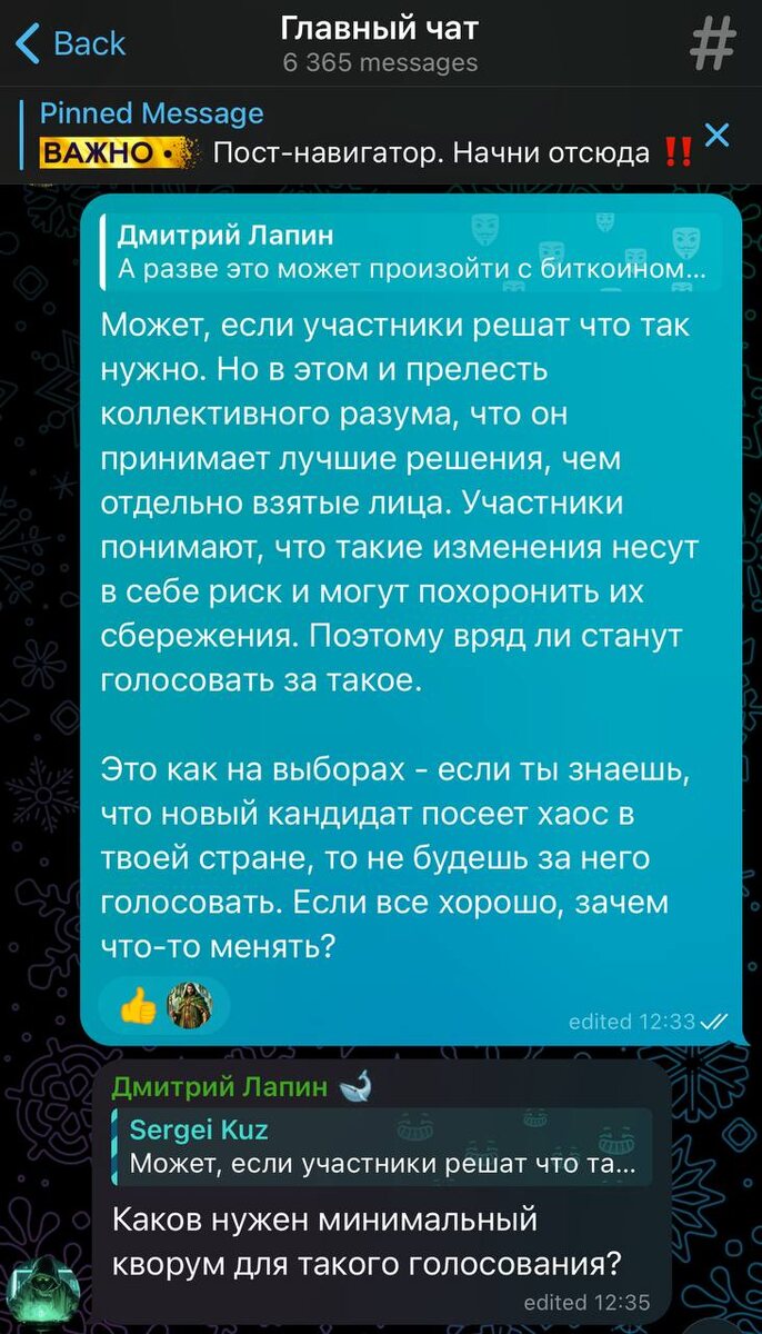 Кто управляет биткоином? Если коротко — никто. И это страшно. Но и прекрасно. На дня в чате АТ обсужлали биткойн и всплыл вопрос: а как вообще принимаются решения в сети биткоина? Кто решает, что «меняем правила»? Где голосование, какой кворум? Спойлер: кворума нет. Формального голосования — тоже. Всё устроено иначе. Биткоин — это система добровольного консенсуса. В ней никто никому не подчиняется, но всё работает, потому что тысячи участников сети согласны играть по одним и тем же правилам. Если кто-то решает «обновить» сеть — он просто предлагает новую версию ПО. А дальше начинается самое интересное: Вот как это работает на практике: 1. Разработчики предлагают изменение (BIP — Bitcoin Improvement Proposal). 2. Майнеры могут сигнализировать поддержку (через блоки). 3. Ноды (узлы сети) выбирают, поддерживать ли новую версию ПО. 4. Изменение входит в силу, только если достаточно нод и майнеров его примут. В итоге, если достаточно нод и майнеров примут изменения — они вступают
