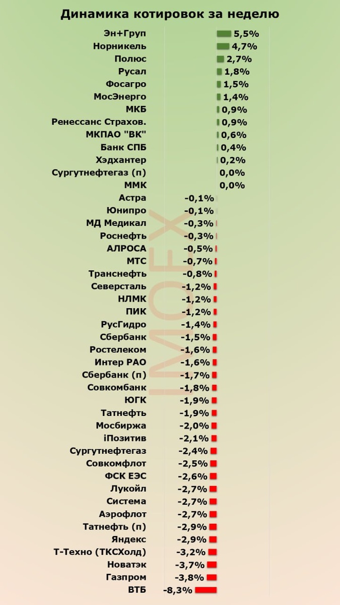 Но вновь согнулся наш рынок под гнётом обещанных нечеловеческих санкций. Хорошо, хотя бы, что согнуться - не значит рухнуть. Индекс Мосбиржи за прошедшую рабочую неделю ушёл в минус 1,6%, хотя вполне мог бы расти. Остаётся надеяться, что лучшее у него, конечно, впереди. Традиционная пятёрка акций из Индекса Мосбиржи с лучшими результатами недели: