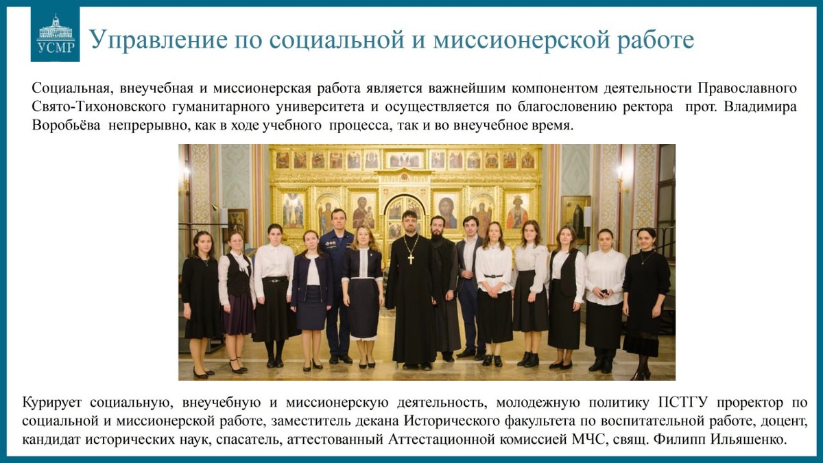 ПРАВИТЬ Знакомимся, мы — канал управления... Годовой отчет управления по социальной и миссионерской работе ПСТГУ — это посты нашего канала. Ежедневно, кроме сессий, мы рассказываем о внеучебной работе, которую организуют сотрудники подразделений управления: • Отдел по социальной работе со студентами — социальная и воспитательная работа; • Центр инклюзивного образования — обеспечение доступности высшего образования лицам с инвалидностью; • Отдел внеучебных программ — миссионерские поездки университета, взаимодействие со спасателями, проектные задачи; • Миссионерский центр — разрабатывает теоретические основы православной миссии. Управления по социальной и миссионерской работе реализует молодежную политику в университете совместно с факультетами, профессорско-педагогическим составом, а также через организацию внеучебных мероприятий со студентами (260 — в 2023/2024 уч. году), работу со студенческими клубами (их 13 в ПСТГУ) и объединениями, реализацию грантовых проектов. Медиадеятельнос