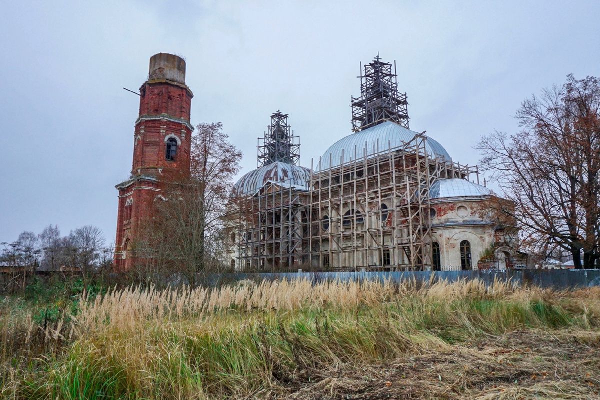 Недавно я очередной раз побывал в Яропольце и увидел храм практически полностью восстановленным. По его территории пока ещё ходят рабочие, за забором слышится дребезжание болгарок, но видно, что недалёк тот день, когда ремонтные работы будут полностью завершены и двери храма откроются для всех. Пока что мне довелось только пройтись вдоль забора под дождём. Так уж повелось, что всякий раз, когда я бываю в Яропольце, идёт либо просто дождь, либо дождь со снегом. Ещё ни разу не был там в ясную погоду.