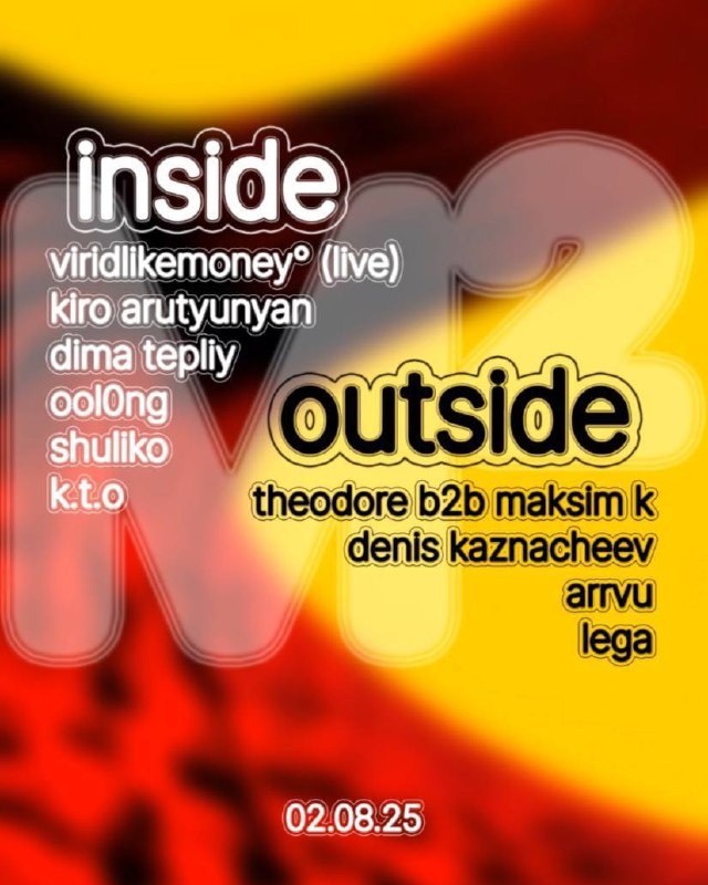 Суббота | М² outside outside 22:00 theodore b2b maksim k 00:00 arrvu 01:30 denis kaznacheev 03:30 lega 05:00 end inside 22:00 dima tepliy 23:30 viridlikemoney° (live) 00:30 kiro arutyunyan 02:30 shuliko 04:30 k.t.o 06:00 ool0ng 🎫 Билеты онлайн 700р На входе 1000₽ FC 18+ 📆 2 августа, с 22:00 📍М2, Москва, Наставнический переулок 13-15 стр. 2