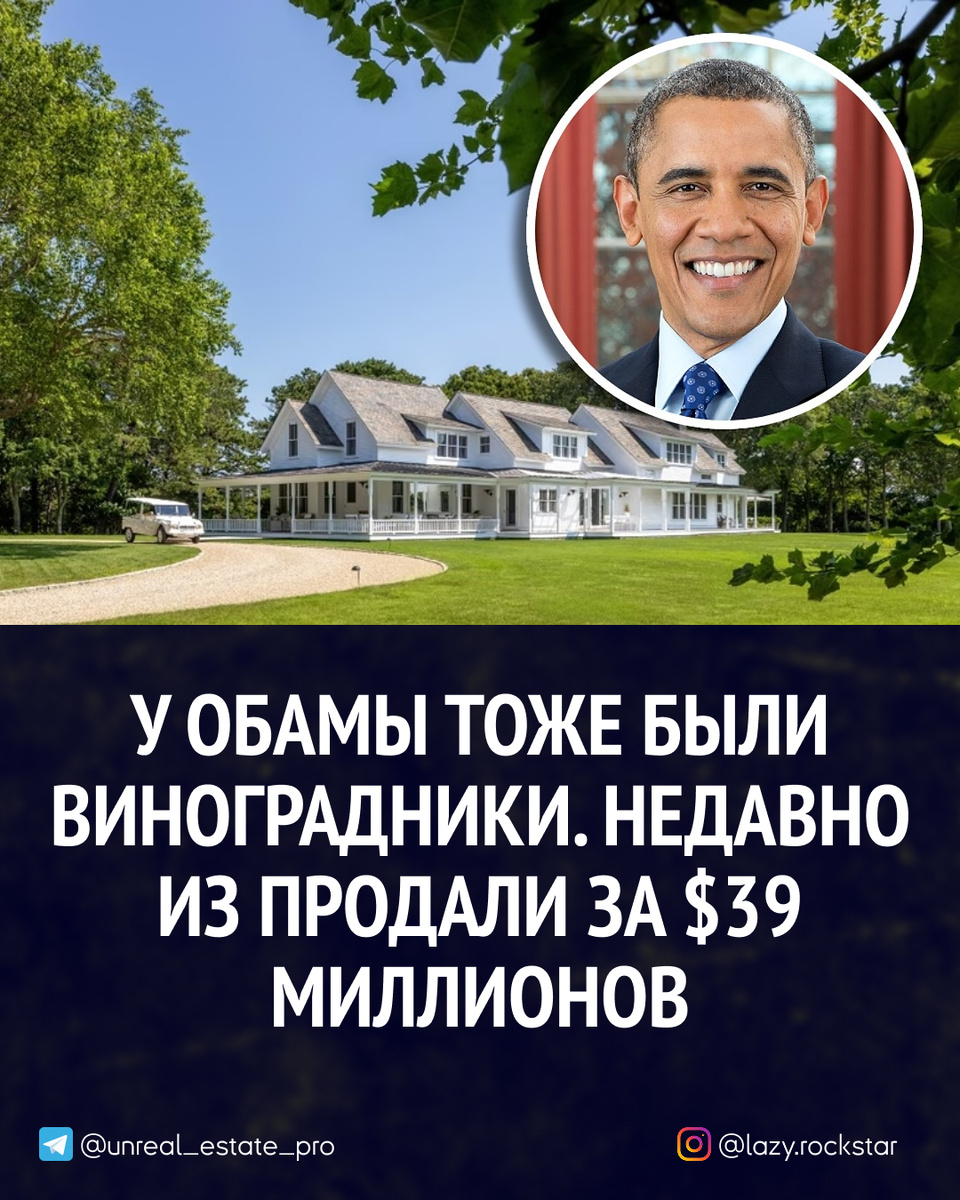 Участок площадью 11,5 акров (≈4,6 га) с виноградниками в Монте-Сито, Калифорния, ранее принадлежавший семье Обамы, был продан за $39 миллионов. Сделка прошла как off-market — без публичного листинга и объявлений. Покупатель — частная компания, имя не раскрывается.
