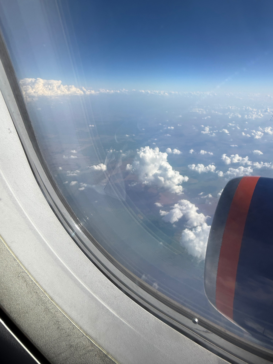 В предыдущей статье, которую я писала в Аэроэкспрессе, а затем - сидя в Шереметьево, я пожаловалась на то, что Озон не прислал в Аэрофлот подтверждение о выборе мест. Соответственно, нас рассадили рандомно на оставшиеся неудобные места в центре ряда. Ладно, я смирилась и стала в уме составлять жалобу на Озон и требование о возврате средств за бронь сидений. Свмолет был большой, 321 Аэрбас, к нему ехали на шатле, зашли в салон в числе первых. Разложила багаж, сели на свои центральные места в разных рядах. Пассажиры прибывали, рассаживались, салон наполнялся. Вот уже и выходы задраили! А рядом со мной никого нет! Пустые сидения! Я пересела к иллюминатов, а после взлета пересадила к сете студента, с разрешения стюардессы, конечно! Так и летели с комфортом! Чудо! Вот еще немного облаков: На обед был выбор: баранина или индейка: В закуске, неожиданно, сельдь с картошкой Я взяла баранину - приготовлено было очень вкусно, в южном стиле! Кофе-чай-прохладителтные и алкогольные напитки разл