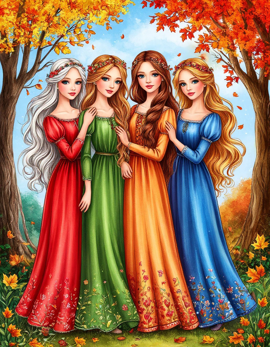 Четыре сестрицы Живут-поживают на свете четыре родные сестрицы: Зима, Весна, Лето, Осень. Они дочери великого волшебника Года. Самая старшая из сестёр - Зима. Любит она всё белоснежное, мягкое и пушистое. А вот характер у неё строгий. Не любит она, когда ей перечат, печей не топят, у огня не греются. Рассердится Зима, морозом так дохнёт, что даже деревья трещат. Весна - младшая из сестёр, самая весёлая и красивая. Любит слушать журчание ручьёв, звон капели, да соловьиные трели. Все наряды у неё зелёные, яркими цветами украшены. Никогда Весна не сердится, а только смеётся да людские сердца веселит. Сестрица Лето любит трудиться: в поле, в саду, в огороде, куда не глянь, везде её увидишь. С косарями Лето сено косит. С комбайнёрами на жатве трудится, с трактористами землю пашет, и с весёлой ребятнёй в речке плещется. Любит Лето зелёный наряд, украшенный спелыми плодами, шляпка у неё из спелых колосьев. Сестрица Осень самая богатая из сестёр. Её закрома полны зерном, овощами и фруктами, со