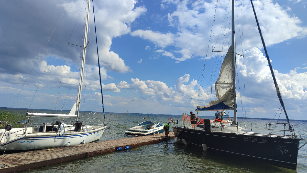 Наконец- был первый день без дождя. Взял велик и три часа катался по окрестностям. Целью было добраться до дальней смотровой площадки и немецкого дота времён первой мировой войны. Конечно, это не марина в какой-нибудь Ницце, но яхты есть. Еду вдоль берега озера Нарочь. Здесь просто красиво. Дикие/полудикие пляжи и места для купания встречаются часто. Вот я долго-долго крутил педали на длиннои подъёме-"тягуне" и выбрался на ещё одну красивую относительно высокую точку: Еду дальше... И вот прямо из-под колёс выскакивает и улетает аист, если приглядеться, его зад можно увидеть, она метрах в восьми от меня, над разделительной полосой, примерно в метре от земли: Впервые сталкиваюсь лицом к лицу с такой здоровенной птицей. Так, в гнёздах, их много сидит, а вот чтобы прямо, считай, из-под колёс - впервые. Наконец доезжаю до смотровой. Это памятник местным белорусским партизанам. А вот это - виды от подножия памятника на озеро Нарочь. Но пора ехать искать дот. Навигатор обещает крутые