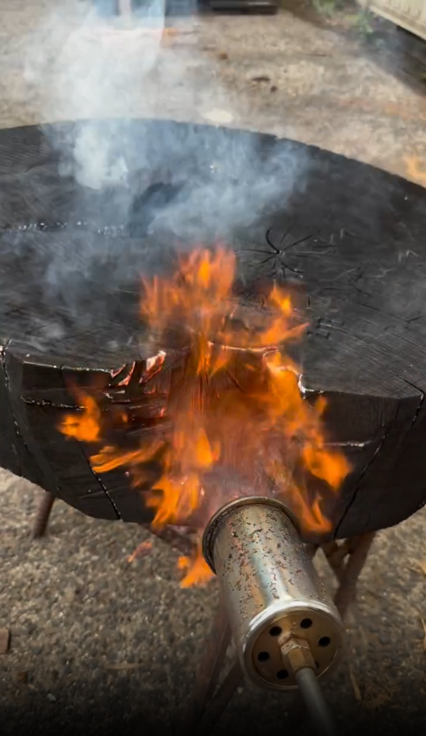 Находим ближайшую пилораму. Распилить здоровенный кусок бревна на чурки или плиты стоит 300–500 ₽. И часто пилорамы сами рады подработать, так что проблем с обработкой нет. 🔹 3. Обжигаем и проявляем красоту
