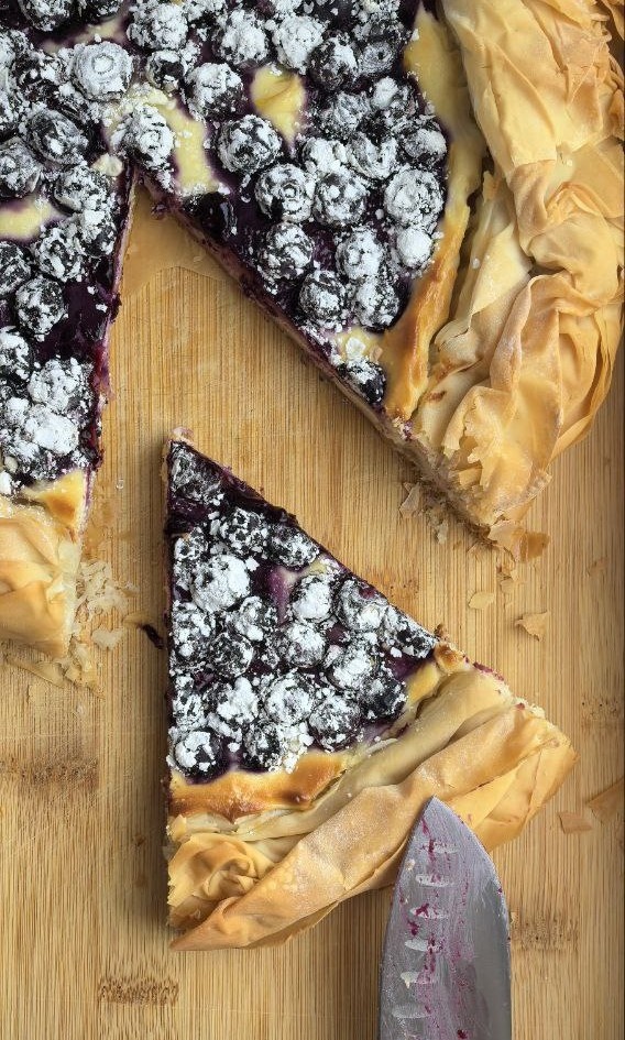 Откуда взялось это тонкое, как папирус, и хрустящее, как осенняя листва, тесто? История фило — это путешествие сквозь века: от дворцов Османской империи до современных кофейен Парижа. Его секрет — в ручной раскатке до почти прозрачных слоёв, которые потом тают во рту, оставляя за собой шлейф из крошек и восторга. И если вы думаете, что фило — это только баклава, то вы... правы. Но только отчасти! Потому что сегодня мы взорвём шаблоны и приготовим сладко-сырный хруст-фило с голубикой — десерт, который заставит вас забыть про все эти круассаны. Хрустящий пирог с голубикой Тесто фило — 10 листов (да, они рвутся, но это часть магии) Голубика — 1 стакан (можно заменить малиной, если вдруг голубика «зазналась») Сыр бри — 1 головка (пусть полежит при комнатной температуре — так он станет податливым, как ваш характер после бокала вина) Сливочный сыр — 2 ст.л. (для кремовой нежности) Сахарная пудра — 2 ст.л. (чтобы жизнь казалась слаще) Желток — 1 шт. (для золотистого гламура) Цедра лимона — 1
