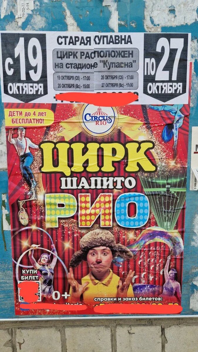 Реклама цирка (2025 г.) в Доме Культуры г. Боровичи (Новгородская область) представляет собой компиляцию афишного (текст) и плакатного (визуальные решения) способа трансляции рекламного сообщения. Обе части рекламы отличаются лаконичностью (с точки зрения информационной насыщенности).