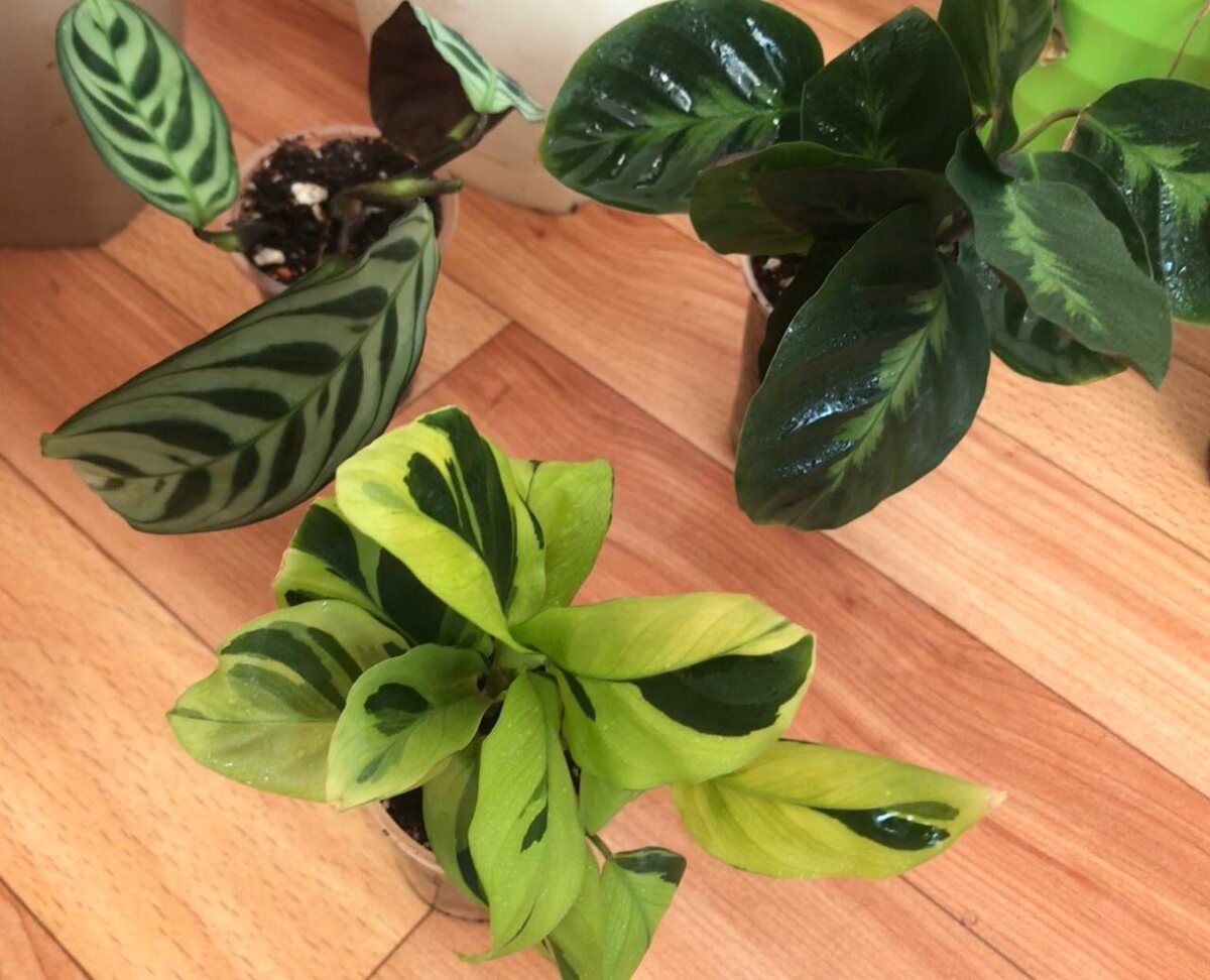 Самая первая зелёно-салатовая это у нас Еллоу Фьюжн (она же Тай Бьюти). За ней слева Ктенанта Бурле Маркси и новенький житель справа - Калатея Мисто (она же по-моему Луиза. Многие путают с Мауи Квин. Но у Мауи рисунок небольшой чёткий, а у Мисто/ Луизы как будто кисточкой этот рисунок размазали по листу)))