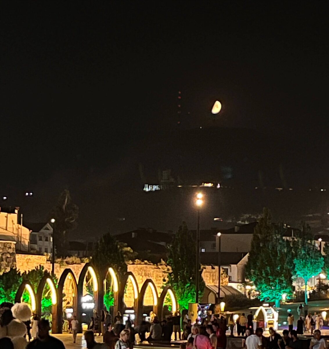 Буквы слова «Дербент» на горе соснового бора уже не горят. Подсветка некоторых букв сгорела.
