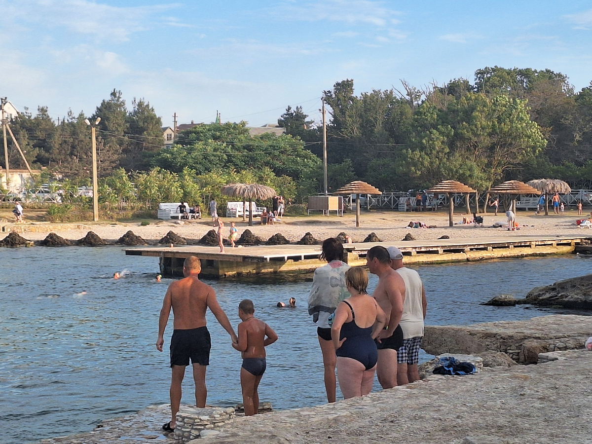 В общем -это не совсем пляж а скорее зона отдыха с возможностью купаться в море. Это место куда ходят купаться отдыхающие, проживающие в многочисленных микро пансионатах, расположенных поблизости. До городского пляжа отсюда около трёх километров, поблизости есть несколько магазинчиков с необходимым набором продуктов, поэтому тем кто отдыхает без автомобиля нет необходимости бывать в посёлке, и многие из года в год приезжают в это уютное местечко.